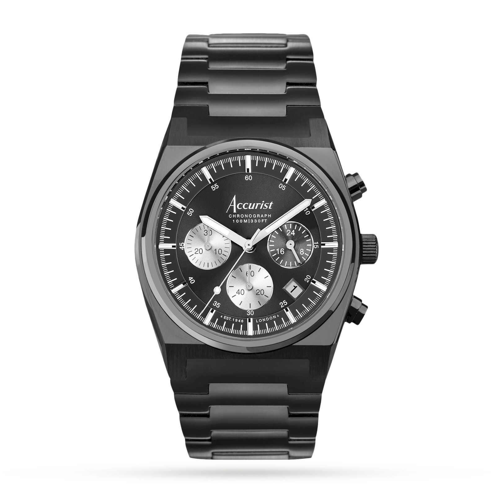 Inspired by 1970’s Accurist models, the watch is fastened with an interchangeable, black ion-plated stainless steel bracelet and has a black ion-plated solid stainless steel case enclosed by sapphire crystal glass. This watch is also water resistant up to 100 metres.