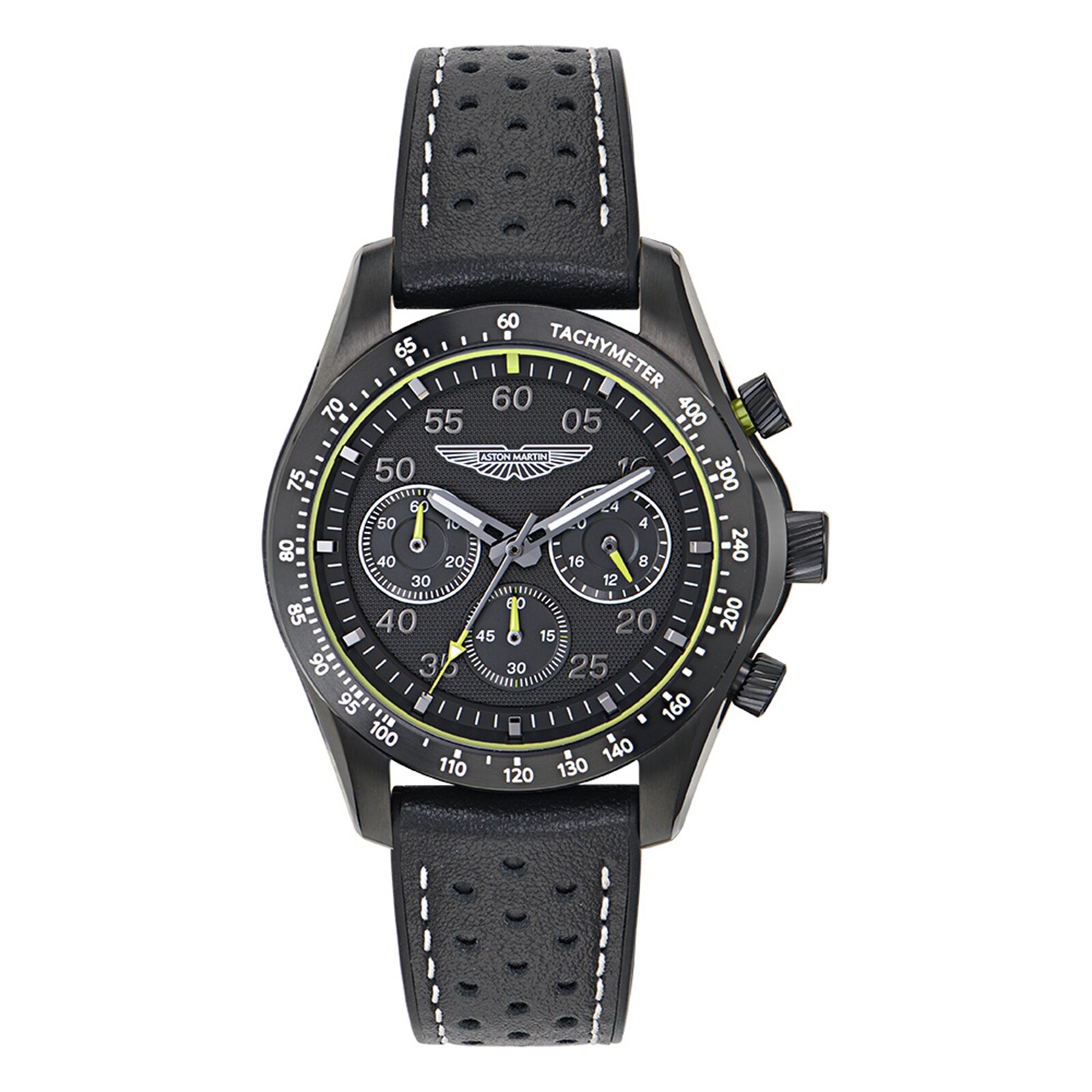 Aston Martin IP Black stainless steel Case, Black Dial, Black Leather Strap