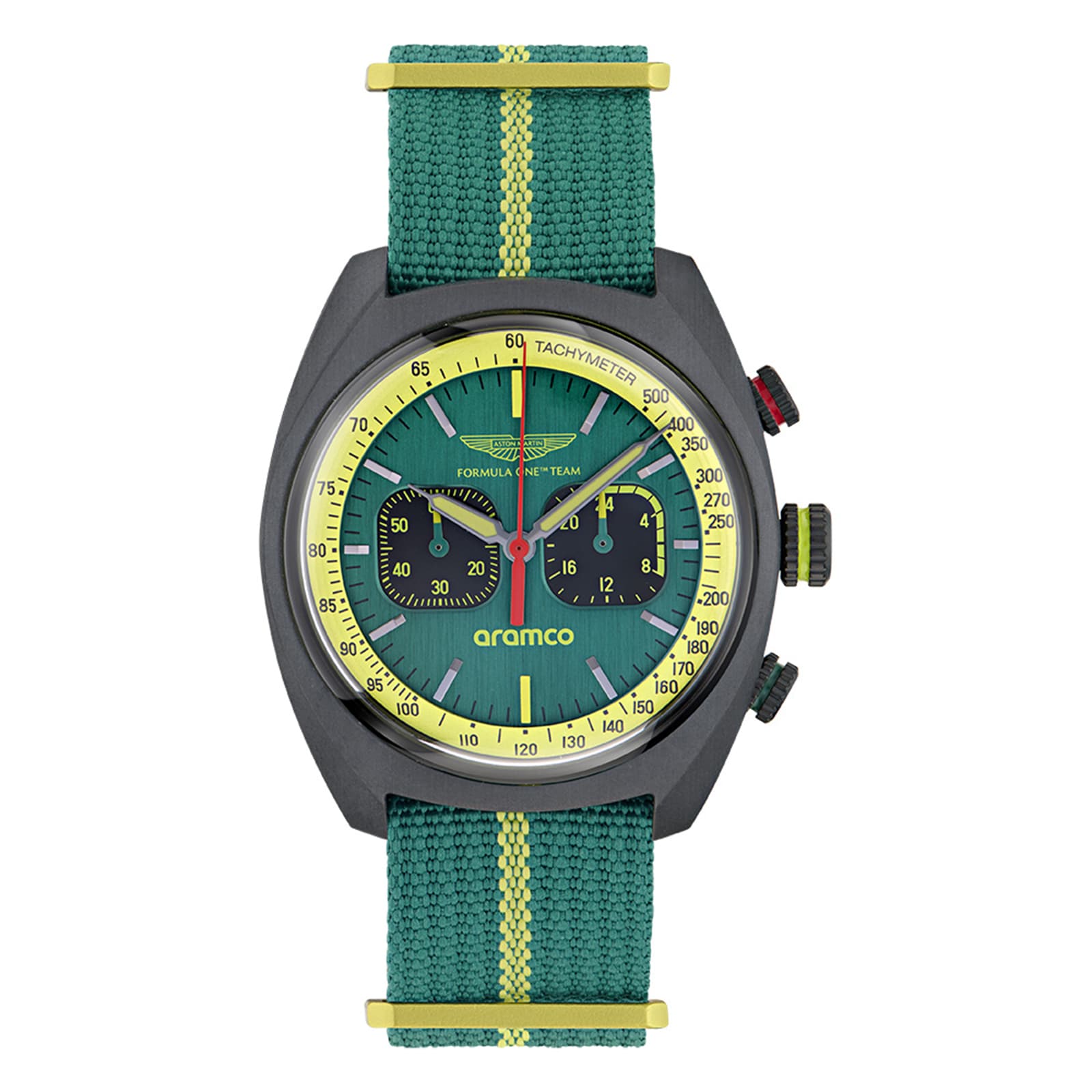 Born on the track, the DWF watch channels Formula 1 energy with a 43mm carbon fiber case, bold squared counters, and the Aston Martin Aramco logo. Pops of Podium Green and Lime Essence bring racing flair, while red, yellow, and green pushers pay tribute to the starting lights. Powered by a Miyota movement, it features domed mineral glass and a high-performance NATO strap with anodized loops. This style is available in Podium Green with Lime Essence. Built to push limits, on and off the circuit.