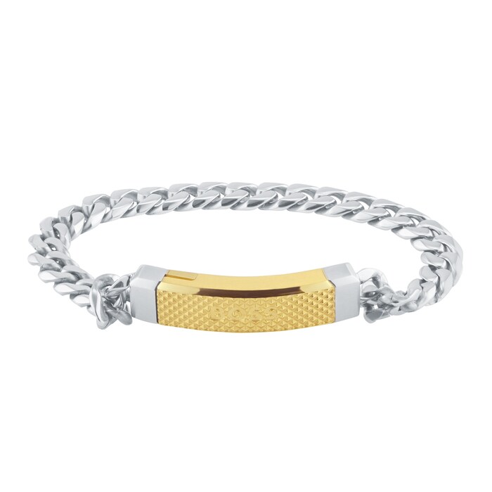 This men's bracelet is a real eye-catcher. It is made of stainless steel and has a curb chain link. The gold-coloured IP coating on the magnetic clasp gives the bracelet a noble touch. The brand name can be read on the textured front. The back of the magnetic clasp can be personalised with an engraving.