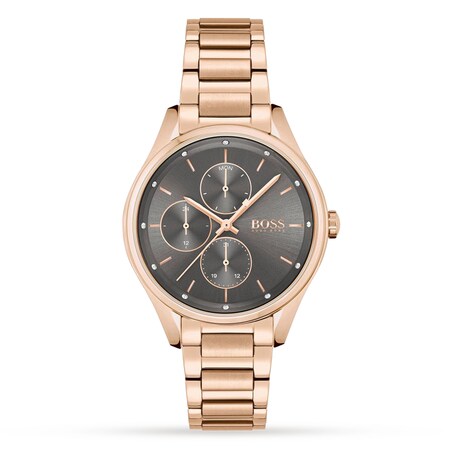 An elegantly styled multi-functional watch by BOSS, detailed with crystal dot and baton watch markers and three sub dials at 6, 9 and 12 o'clock on the dial. Featuring a sunray-brushed grey toned dial and fixed with a stainless steel and rose gold pvd case and bracelet. Powered by quartz movement and water resistant at upto 30 metres.