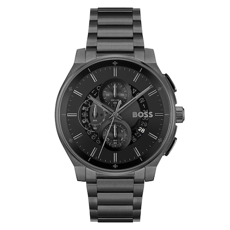 Engineered with a precision movement that's visible through the dial, this BOSS Menswear watch is a confident style choice. Ergonomically shaped pushers. Layered matte dial.