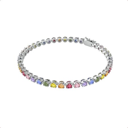 From our By Request collection, this 18ct White Gold Line Bracelet is set with a Rainbow of 43 round Sapphires in a claw setting. Stone Measurements: 43 x 3.4mm Round Coloured Sapphires, A Grade. Each Sapphire is approx 0.20ct, with a total weight of approx 8.60ct. By Request product is ordered direct from our supplier and is bespoke made to each order. This image is a CAD (Computer Aided Design)