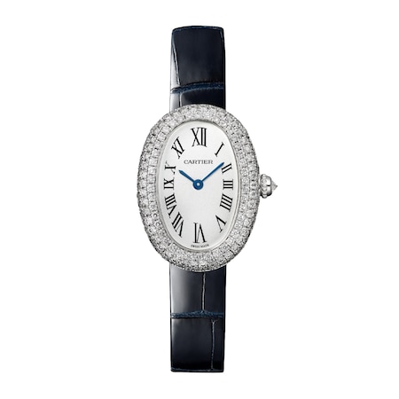 Baignoire watch, small model, quartz movement. 18K white gold (750/1000) case set with brilliant-cut diamonds. 18K white gold (750/1000) beaded crown set with a brilliant-cut diamond. Silver 925/1000 dial, blued-steel sword-shaped hands, sapphire crystal. Strap in navy blue alligator leather, with rhodiumized 18K white gold (750/1000) ardillon buckle. Case dimensions: 32 mm x 26 mm. Thickness: 8 mm. Water-resistant up to 3 bar (approx. 30 meters/100 feet).