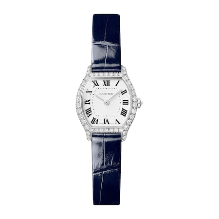 Tortue watch, mini model, high-power quartz movement. 18k white gold (750/1000) case set with 42 brilliant-cut diamonds totaling 0.77 carats. Octagonal crown in 18k white gold (750/1000) adorned with a 0.04-carat brilliant-cut diamond. White dial, rhodium-plated steel sword-shaped hands, sapphire crystal. Glossy navy blue alligator strap, 18k white gold (750/1000) pin buckle. Length: 26.1 mm, width: 20.9 mm, thickness: 6.9 mm. Water-resistant to 3 bar (approximately 30 meters).