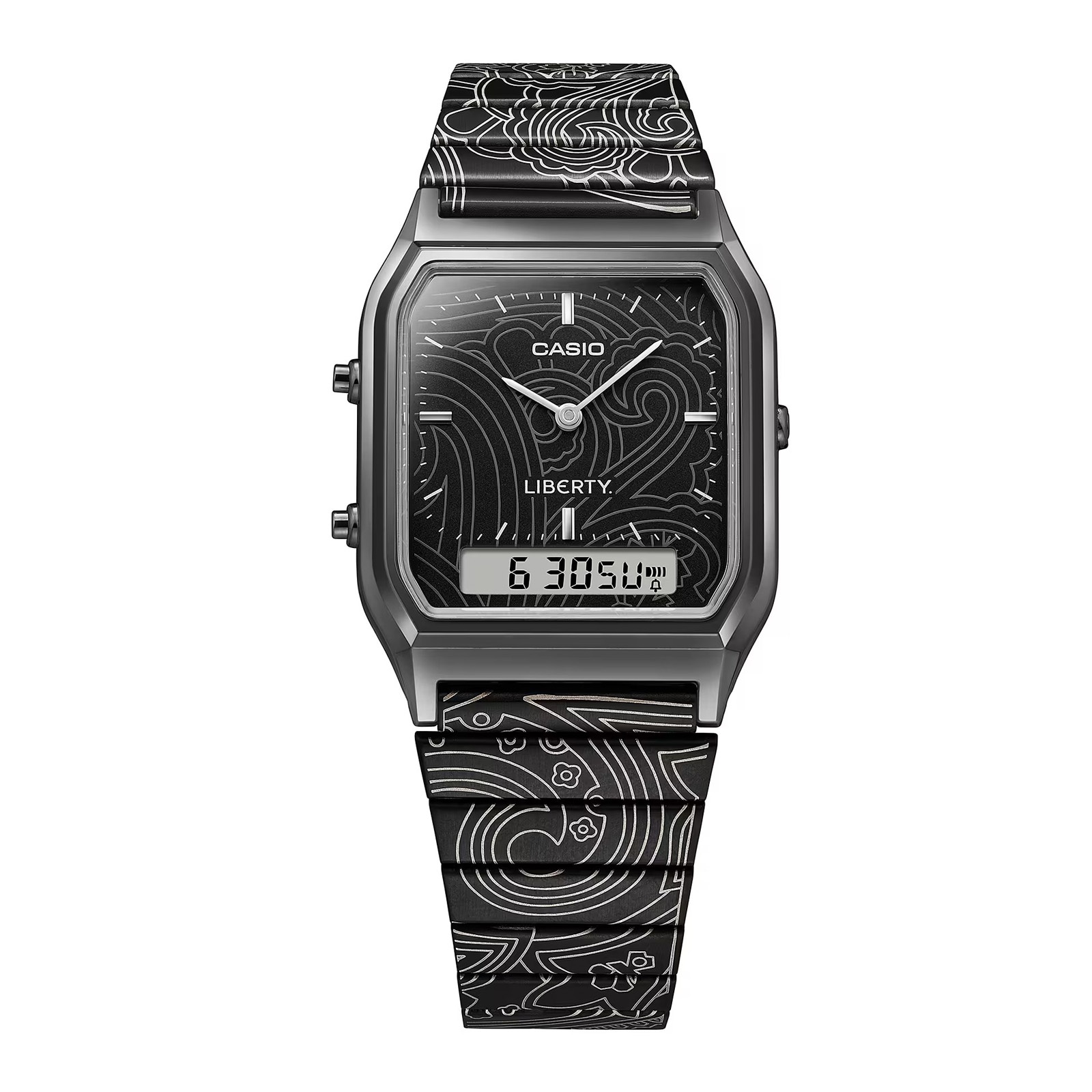 Introducing classic Casio in lush, sophisticated paisley from the British luxury design house, Liberty. For this singular collaboration, we dress the popular AQ-230 with its angular face and analog-digital display in a pattern inspired by renowned Liberty Paisley Fanfare. The angular lines of the timepiece present an urbane contrast to the beautiful curves of the classic paisley pattern on the band and dial in elaborate laser-engraved detail. Complete with the Liberty logo engraved on the buckle and case back, and special packaging designed in a Paisley Fanfare, meticulous attention to every detail makes this a timepiece worthy of a Casio×Liberty collaboration. Choose your favorite color scheme — silver case with silver band or gunmetal gray case and black band — in a versatile unisex design that pairs perfectly with any style. LIBERTY Born in 1875 from the adventurous and disruptive spirit of Arthur Lasenby Liberty, the brand has remained true to its heritage and is famed for its print, fabrics, and design. Liberty continues to be associated with the world of arts and culture, building on its founder’s legacy to seek out the new and the beautiful. Today, Liberty is recognised for its cultural collaborations, inspiring curation, and directional design. The iconic Regent Street shop encompasses six floors of fashion, beauty, accessories and homewares - bringing together the world’s leading premium and luxury brands and housing them alongside its own Liberty range.