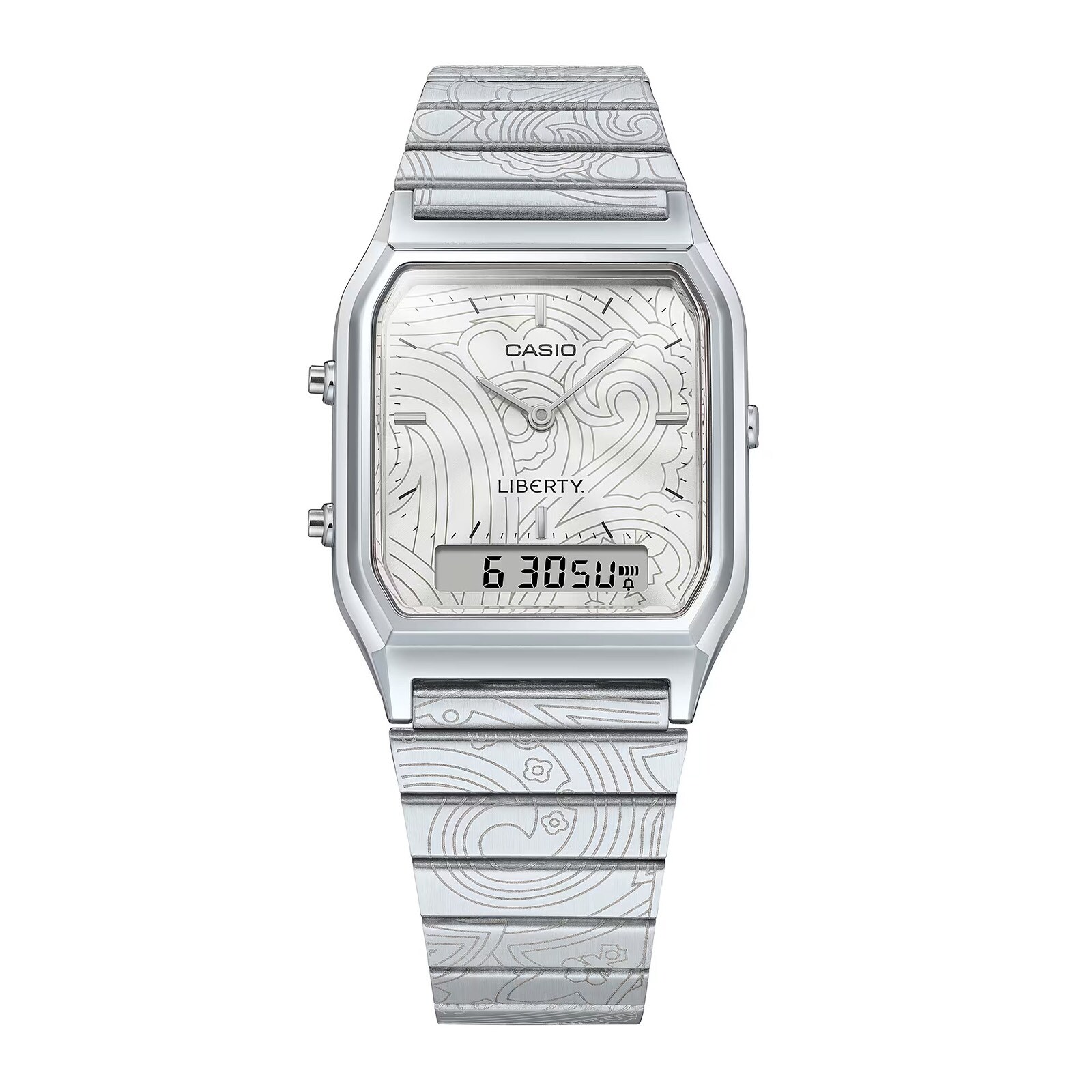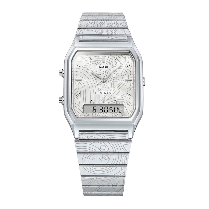 Introducing classic Casio in lush, sophisticated paisley from the British luxury design house, Liberty. For this singular collaboration, we dress the popular AQ-230 with its angular face and analogue-digital display in a pattern inspired by renowned Liberty Paisley Fanfare. The angular lines of the timepiece present an urbane contrast to the beautiful curves of the classic paisley pattern on the band and dial in elaborate laser-engraved detail. Complete with the Liberty logo engraved on the buckle and case back, and special packaging designed in a Paisley Fanfare, meticulous attention to every detail makes this a timepiece worthy of a Casio×Liberty collaboration. Choose your favorite color scheme — silver case with silver band or gunmetal gray case and black band — in a versatile unisex design that pairs perfectly with any style. LIBERTY Born in 1875 from the adventurous and disruptive spirit of Arthur Lasenby Liberty, the brand has remained true to its heritage and is famed for its print, fabrics, and design. Liberty continues to be associated with the world of arts and culture, building on its founder’s legacy to seek out the new and the beautiful. Today, Liberty is recognised for its cultural collaborations, inspiring curation, and directional design. The iconic Regent Street shop encompasses six floors of fashion, beauty, accessories and homewares - bringing together the world’s leading premium and luxury brands and housing them alongside its own Liberty range.