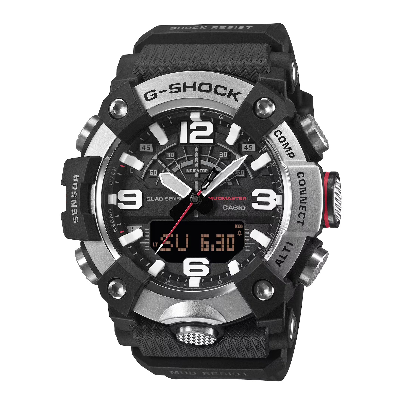 The GG-B100XM-1AER features a silvery stainless-steel bezel with a honed finish, offering excellent scratch resistance and protection from mud and debris, while its subtle matte texture reduces unwanted reflections. The GG-B100XMB-1AER takes a darker approach, with a black ion-plated stainless-steel bezel finished to a mirror sheen that balances durability with refined presence. At the heart of the GG-B100 MUDMASTER is a high-rigidity carbon case that resists damage and distortion while maintaining exceptional airtightness and shock resistance. A dedicated mud-resistant filter, stainless-steel screw-back and a shock-resistant resin back cover reinforced with glass fibres work together to provide outstanding resistance to dust and mud. Selected case and band components are made from bio-based resin derived from renewable organic resources, helping to reduce environmental impact. Designed for real-world utility, this watch is equipped with a digital compass, altimeter and barometer, thermometer and step counter. Time correction is simple via the CASIO WATCHES app, which also unlocks features such as Mission Log, automatically combining altitude data from the watch with route data from your smartphone. When every second counts and conditions are unpredictable, this is a watch you can rely on to support fast decisions with style.