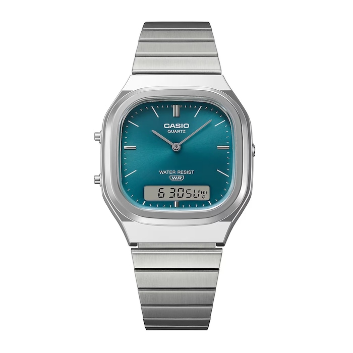 Introducing the latest addition to the AQ series - the AQ-240E, where retro character meets modern design in a truly timeless piece. This analogue-digital has a slightly rectangular case, with softly rounded edges and sleek metallic lines for a polished, sophisticated finish. The sun-ray dial catches the light beautifully, while the metallic hour markers balance classic charm with a contemporary feel. A clear digital display at 6 o’clock makes it easy to read the time at a glance, keeping the overall design clean and balanced — a watch that’s as practical as it is effortlessly stylish.