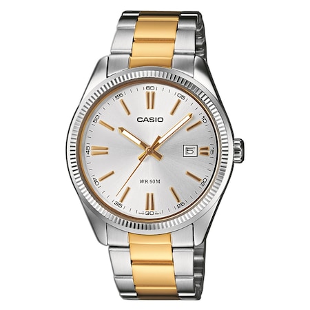 Experience the perfect blend of timeless elegance and contemporary flair with the Casio Classic Watch. This watch is water-resistant up to 50 meters, powered by quartz movement, and protected by acrylic glass, offering both style and durability. It features a practical day/date window at 3 o'clock and is complemented by a stainless-steel case and a two-tone bracelet, enhancing its smart appeal. The Casio Classic Watch is a remarkable timepiece that excels in both form and function.