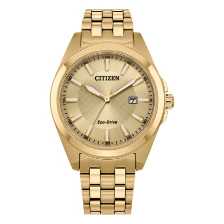 Styled in gold-tone stainless steel with a matching gold-tone dial, this timepiece effortlessly completes any look. This 3-hand timepiece features gold-tone luminous hands and markers, sapphire crystal and date display at the 3 oclock position. Sustainably powered by any light with our Eco-Drive technology.