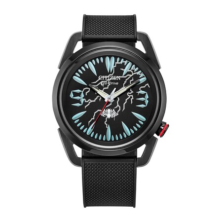 Spider-Man’s nemesis has main-character energy in the all-new inspired boxed set devoted to Venom, the alien symbiote with a shape-shifting, liquid-like form and an equally fluid personality. The deep black dial features Venom’s signature teeth in the form of luminous markers along with his own spider symbol, an alternative design of his hosts Peter Parker’s logo, finished by ink-jet lightning. The 42mm black IP stainless steel case and textured polyurethane strap contrast the red second hand and crown at the 4 o’clock position. The case back is etched with his likeness, and the set is completed by a collectible coin that features Spider-Man on one side and his arch-enemy on the other: Super Hero and Anti-Hero. Contrary to Venom’s dark side, this watch is powered by any light with Eco-Drive technology and never needs a battery.