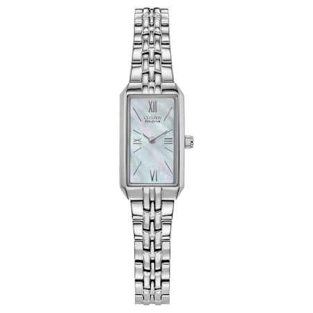 Perfectly complete any look with the elegance of this Silhouette from Citizen. With a stainless-steel 26mm case paired with a stainless-steel bracelet, this watch fits seamlessly on the wrist. The look is completed with a beautiful Mother-of-Pearl dial and silver-tone hands and markers. Additional features include water resistance and a jewellery clasp with push button release. Sustainably powered by any light with Citizen Eco-Drive technology - never needs a battery.