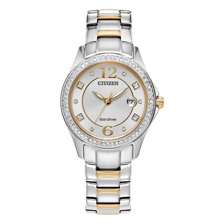 Classic lines and a hint of sophistication makes this Silhouette Crystal stand out. Decorated with crystals on the stainless-steel case and silver-tone dial and paired with a two-tone stainless-steel case and bracelet. Completed with date display and a fold over clasp with push buttons. Featuring Eco-Drive technology powered by light, any light. Never needs a battery.