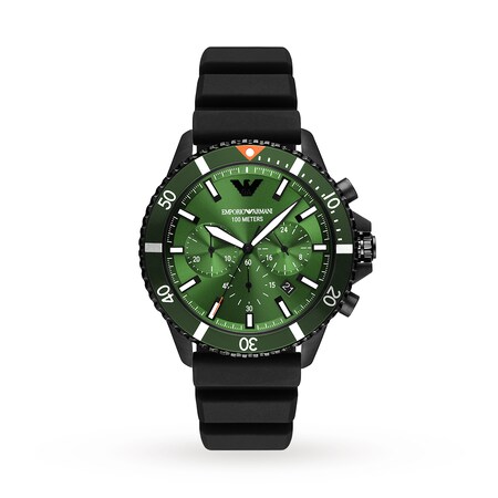 43mm watch featuring a green sunray, cd finish dial, at least 50% recycled stainless steel case, chronograph movement and black silicone strap.