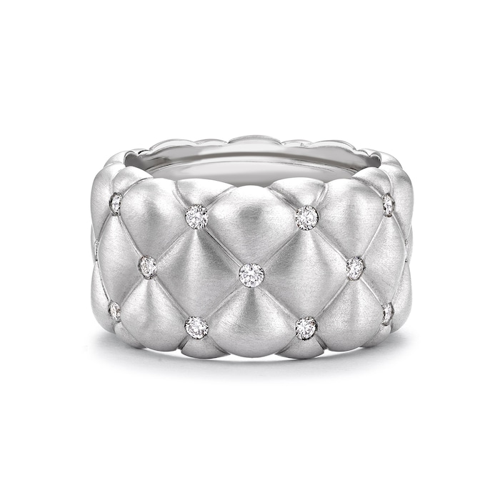 The Treillage collection is inspired by the Diamond Trellis Egg, created by Fabergé in 1892. The evocative designs, with their soft, tactile and gem-set quilting, represents the perfect marriage of heritage and modernity. The ring is 13mm in width.