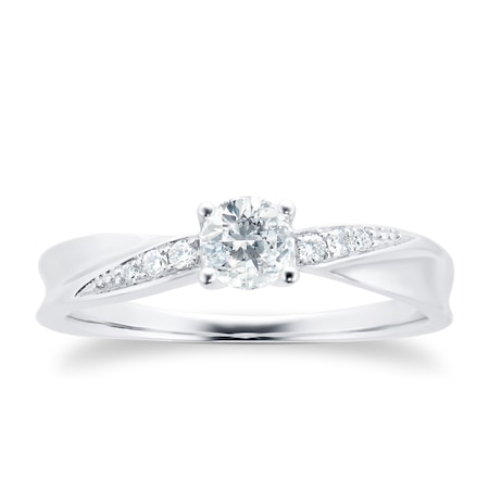 A round brilliant cut diamond with twisted diamond set shoulders on an 18 carat white gold band, presented in a clean four-claw setting. With 0.30 carat total gemstone weight.