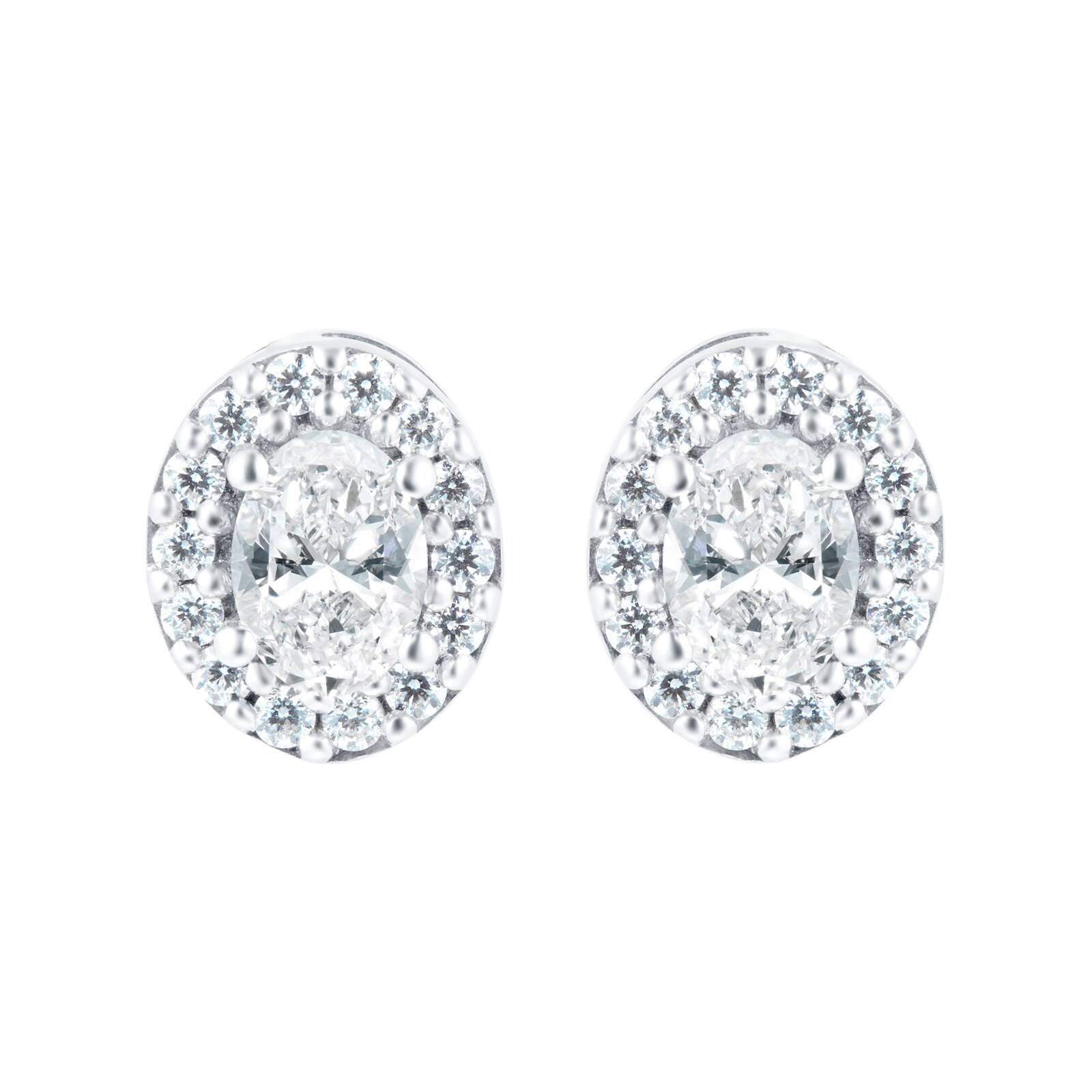 A luxurious pair of studs, these oval cut diamond earrings feature a central glistening diamond, framed by a dazzling halo of smaller gemstones.