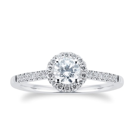 With 0.60 carat total weight, a glistening central centre diamond is framed by a dazzling single halo of smaller diamonds, providing this ring with modern appeal.