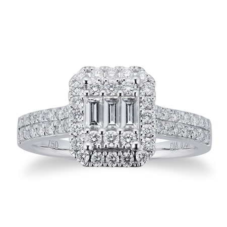 With 0.75 carat total weight, glistening baguette cut diamonds sit at the heart of this striking engagement ring, framed by a radiant halo of smaller, round cut diamonds.