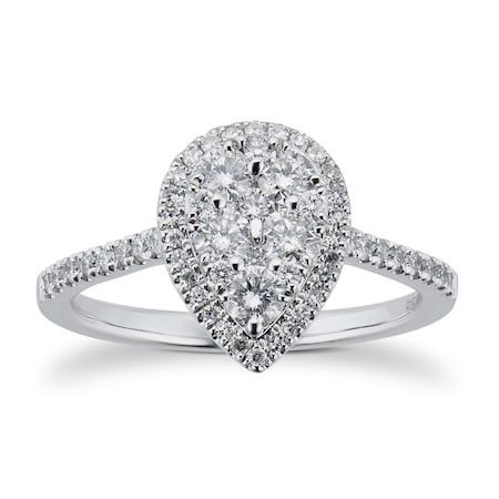 - Multi-stone pear-shaped focal point framed by a halo of additional diamonds providing 0.75ct total carat weight
