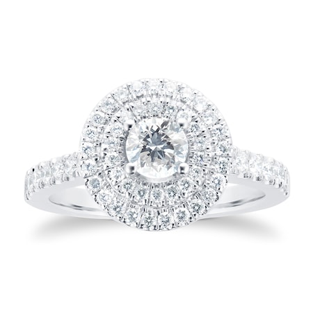 Presented in a clean elegant and classic 4 claw setting surrounded by a halo of diamonds this 88 Facet Brilliant Cut 0.90 carat total weight Diamond Engagement Ring with diamond set shoulders in 18 carat white gold is a luxurious piece for the perfect proposal.
