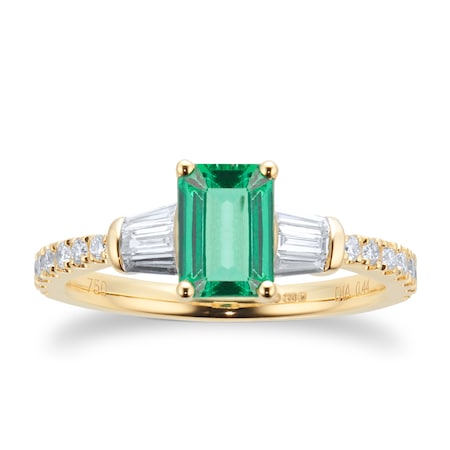 With 0.44 carat total weight, a bright emerald sits centrally with two brilliant diamonds mounted to an 18ct yellow gold band.