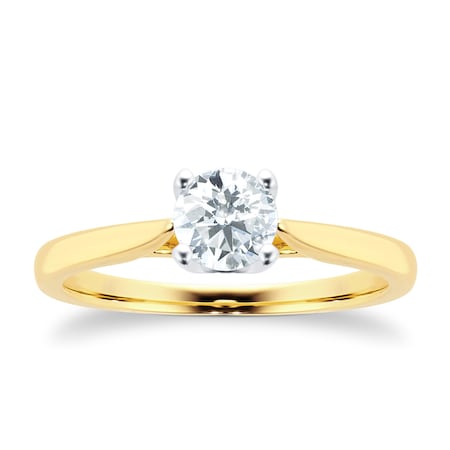 A classic four-claw setting presents a round brilliant cut diamond on a 18ct yellow gold ring. With traditional solitaire styling and 0.50 carat diamond weight, this diamond engagement ring is a truly special piece.