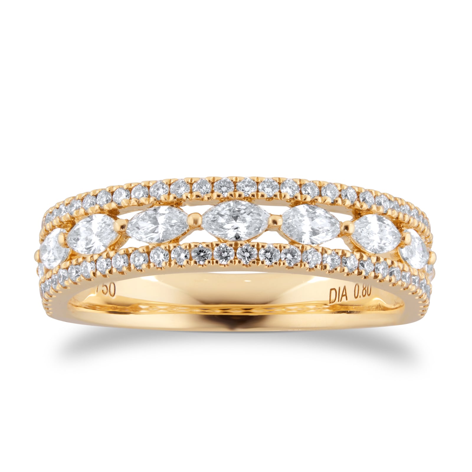 With 0.80ct total weight of diamonds, across a central band of marquise cut stones, flanked by twin rows of round brilliant cut diamonds, this multi-row eternity ring is extravagantly brilliant. The 18ct yellow gold band adds a warmth and sophistication to this standout piece.