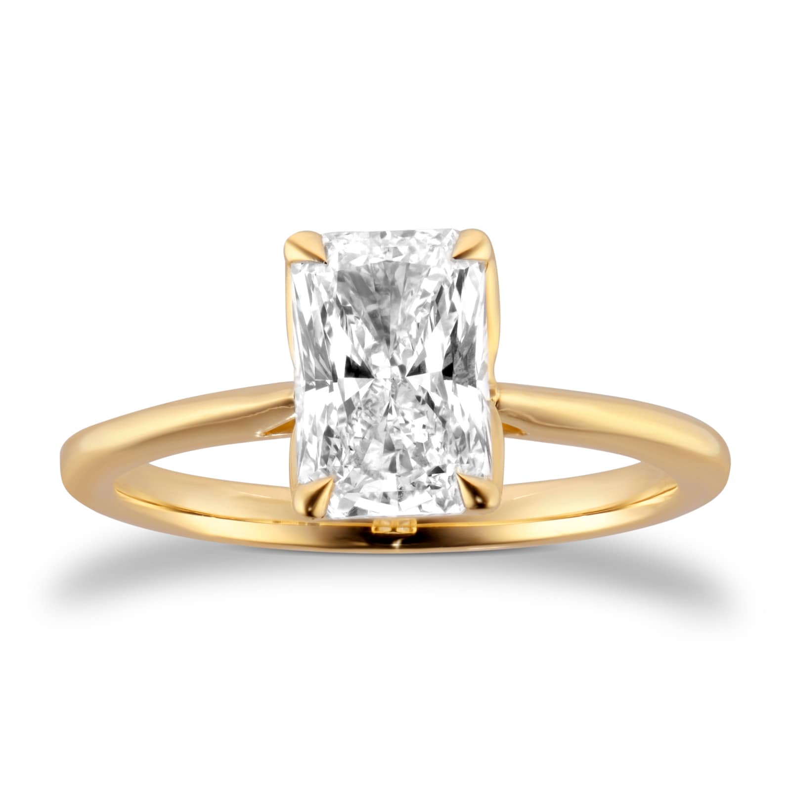This 18ct yellow gold engagement ring features a single radiant cut lab-grown diamond weighing 1.50ct. The central stone is certified by the International Gemological Institute, and is selected for its exceptional clarity and colour — the highest standards of excellence.