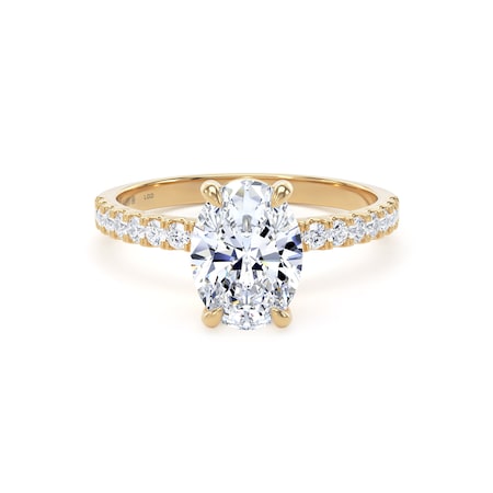 This 18ct yellow gold engagement ring features a 1.50ct oval cut lab-grown diamond at its centre, flanked by delicately set shoulder stones for a total diamond weight of 1.70ct. The central stone is certified by the International Gemological Institute and selected for its exceptional clarity and colour.