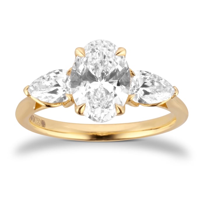 This 18ct yellow gold engagement ring features a 1.50ct oval cut lab-grown diamond at its centre, which is certified by the International Gemological Institute. This is flanked by two pear cut side stones for a total diamond weight of 2.00ct. The combination of cuts creates a balanced silhouette with graceful brilliance.