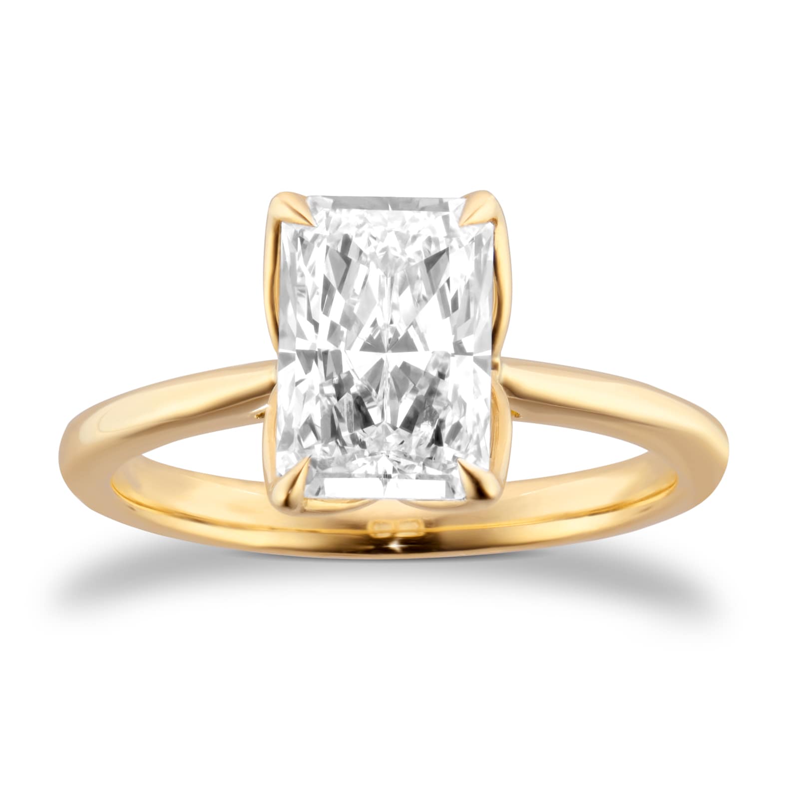 This 18ct yellow gold engagement ring features a single radiant cut lab-grown diamond weighing 2.00ct. The central stone is certified by the International Gemological Institute, and is selected for its exceptional clarity and colour — the highest standards of excellence.