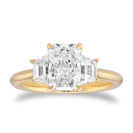 This 18ct yellow gold engagement ring features a 1.50ct radiant cut lab-grown diamond at its centre, certified by the International Gemological Institute. Two trapezoid cut side stones complete the composition, bringing the total diamond weight to 2.16ct.