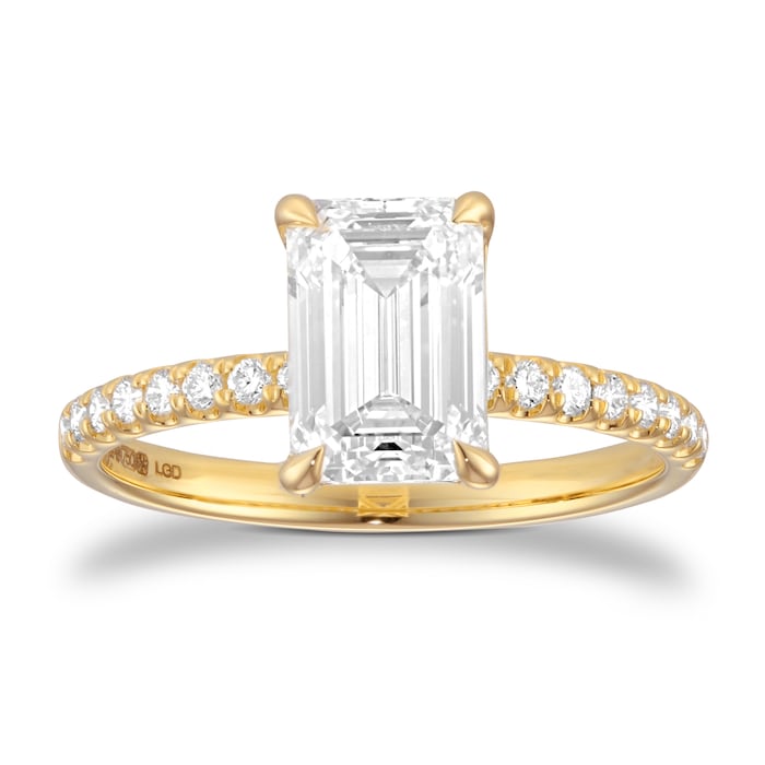 This 18ct yellow gold engagement ring features a 2.00ct emerald cut lab-grown diamond at its centre, flanked by delicately set shoulder stones for a total diamond weight of 2.20ct. The central stone is certified by the International Gemological Institute and selected for its exceptional clarity and colour.