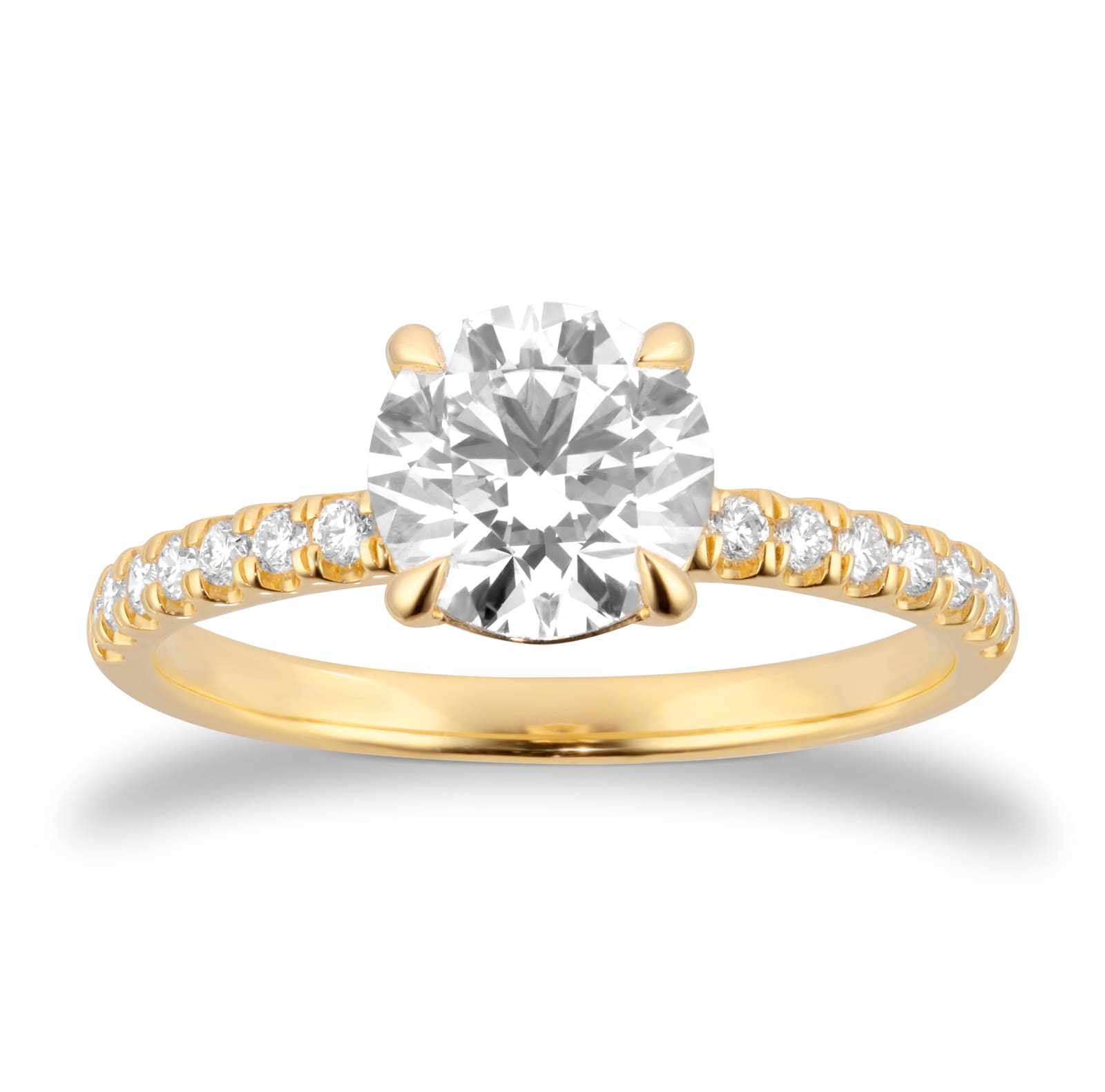 This 18ct yellow gold engagement ring features a 2.00ct round brilliant lab-grown diamond at its centre, flanked by delicately set shoulder stones for a total diamond weight of 2.20ct. The central stone is certified by the International Gemological Institute and selected for its exceptional clarity and colour.