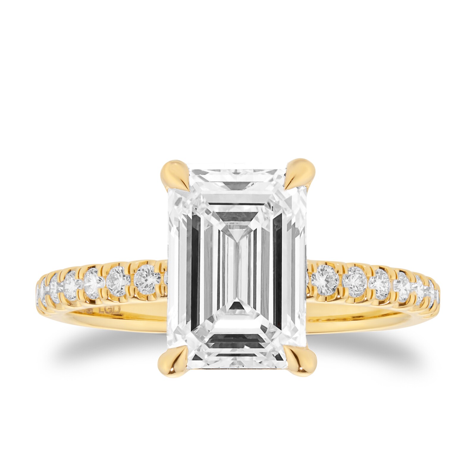 This 18ct yellow gold engagement ring features a 2.50ct emerald cut lab-grown diamond at its centre, flanked by delicately set shoulder stones for a total diamond weight of 2.70ct. The central stone is certified by the International Gemological Institute and selected for its exceptional clarity and colour.