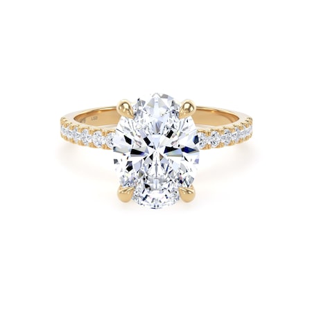 This 18ct yellow gold engagement ring features a 2.50ct oval cut lab-grown diamond at its centre, flanked by delicately set shoulder stones for a total diamond weight of 2.70ct. The central stone is certified by the International Gemological Institute and selected for its exceptional clarity and colour.