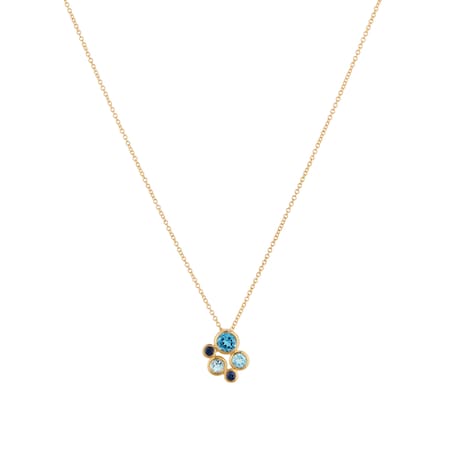 Set in glowing 18ct yellow gold, with sapphire, aquamarine and blue topaz as the centrepiece, the stones are encompassed in a harmonious bezel setting.