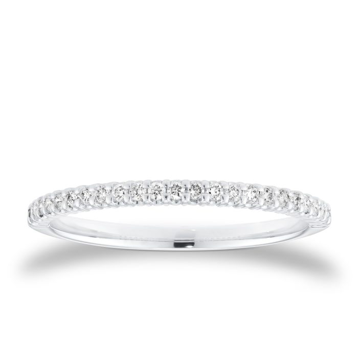 This 9ct white gold half eternity ring features 0.15ct of round brilliant cut diamonds, arranged to create a delicate shimmer. Its slim profile makes it ideal for stacking, allowing you to personalise your look with effortless sophistication.
