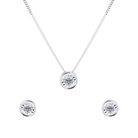 With 0.20 carat total weight, this diamond illusion jewellery set features a diamond pendant on a 9ct white gold chain, paired with radiant diamond stud earrings.
