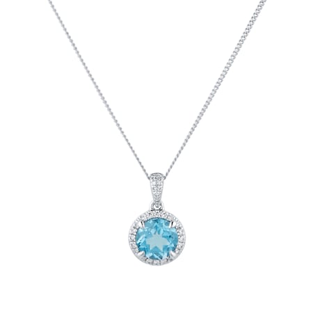 This striking necklace presents a round blue topaz gemstone, framed by a dazzling halo of smaller diamonds and suspended from the 9ct white gold chain by a diamond-set clasp.