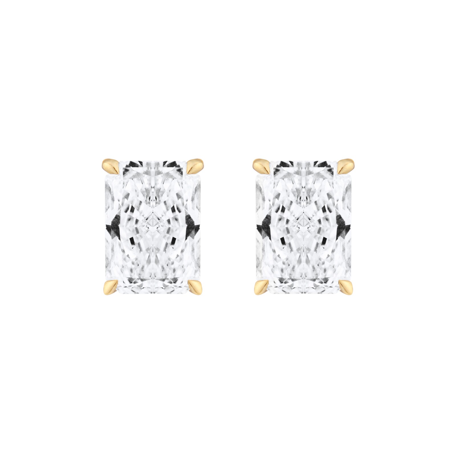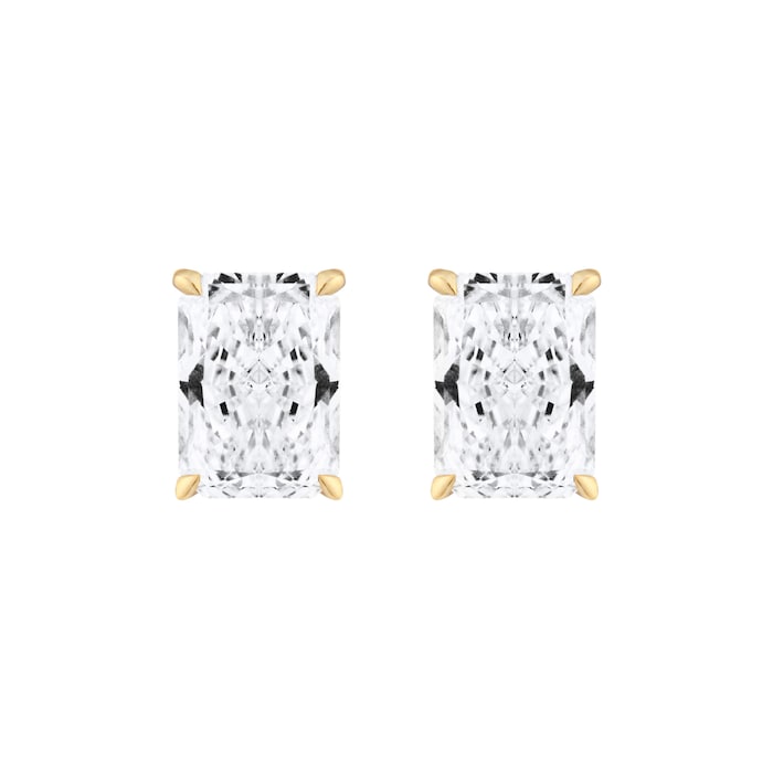These 9ct yellow gold stud earrings feature two radiant cut lab-grown diamonds, each weighing 0.75ct, for a total carat weight of 1.50ct. The radiant cut combines the brilliance of a round with the elegance of an emerald shape, offering a contemporary silhouette with exceptional sparkle.