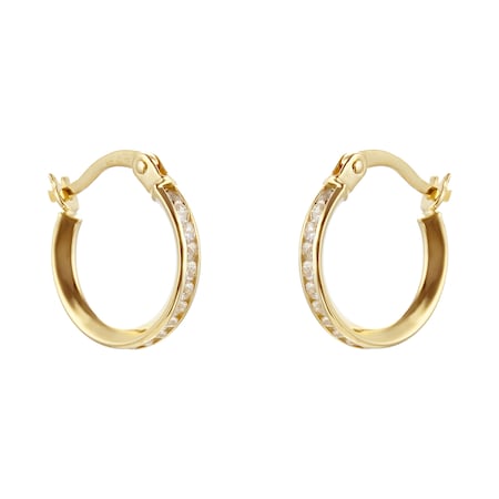 10mm hoops in 9ct yellow gold are lined with round brilliant cut cubic zirconia for a subtle shimmer.