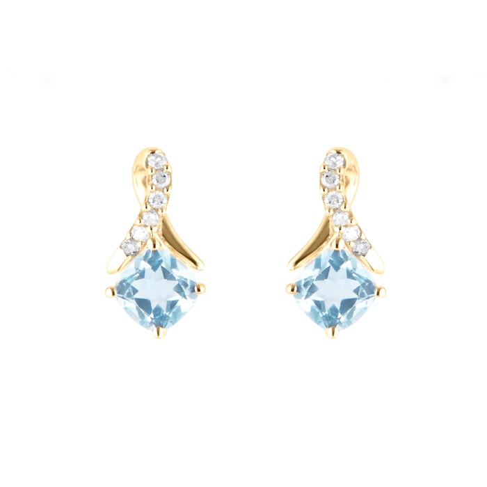 This pair of drop earrings are set in 9ct yellow gold and each stud features a cushion cut blue topaz as the focal point, alongside a delicate trickle brilliant cut diamond to finish this piece. The 9ct yellow gold setting enhances the bright hues of the topaz, while the diamonds provide a subtle sparkle. Perfect for everyday elegance or special occasions, this pendant is a stunning addition to any jewellery collection.