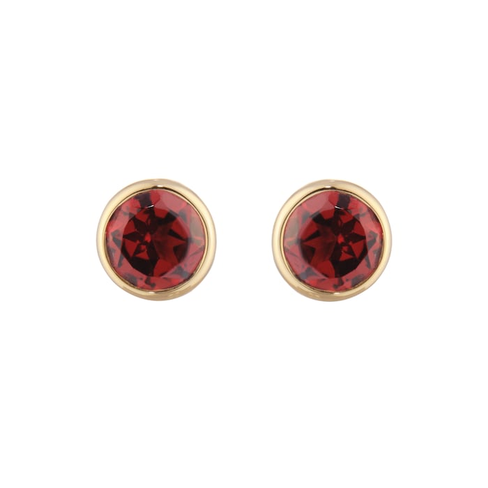 This pair of birthstone stud earrings are truly captivating, each with a central, round garnet stone and in a harmonious bezel setting.