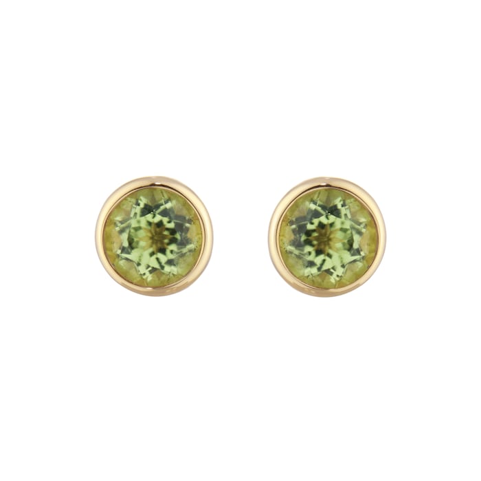 This pair of birthstone stud earrings are truly captivating, each with a central, round Peridot stone in a harmonious bezel setting.
