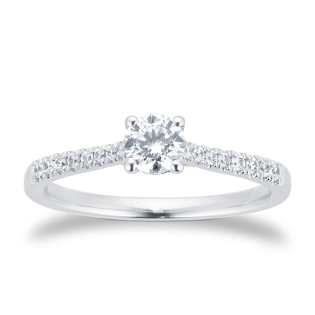 Held in a traditional four claw setting and with a diamond set band for increased scintillation