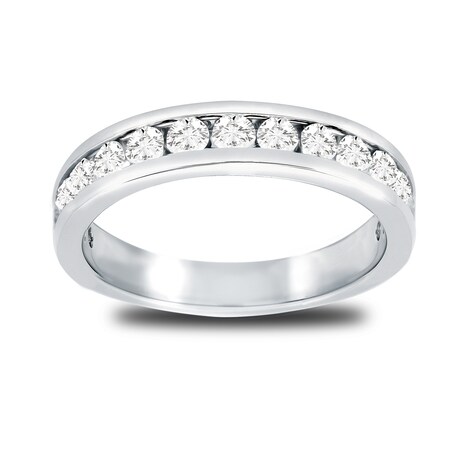 With .80 carat total weight, this eternity rings features a glistening row of brilliant cut diamonds, channel set in a platinum band.