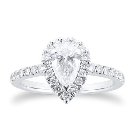 Set on a delicate platinum band, a mesmerising pear-cut central diamond is embraced by a halo of equally radiant diamonds totalling 0.80 carats.